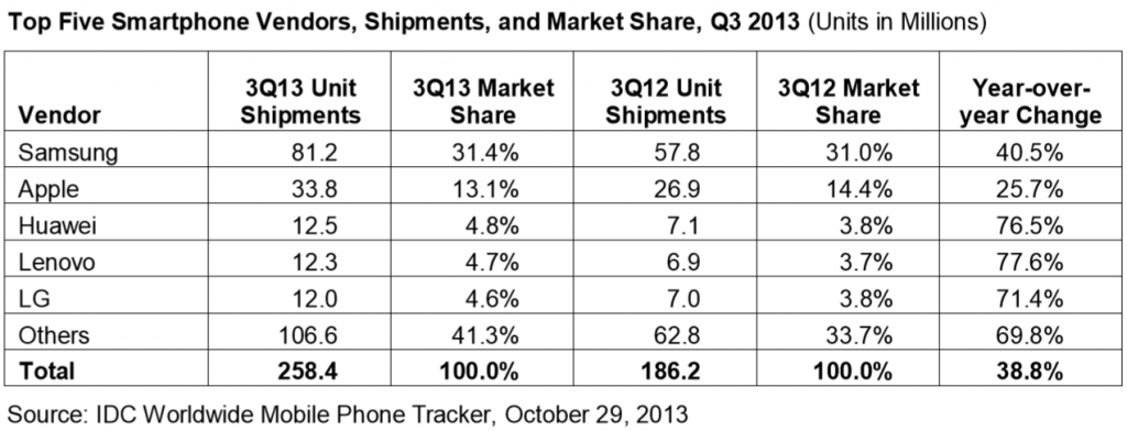 We have been taking a look at the Smartphone market through the regular analyses from the folks at IDC, and the report for the 3rd quarter of 2013 is now out. The key takeaways from this quarter is that the overall smartphone market has grown at a record breaking pace, with 38.8% growth. The total Smartphone shipments are now at 258.4 million, higher than the earlier record last quarter, which was 237 million. The overall mobile phone market is now at a healthy 467.9 million shipments, with over 55% of the shipments being Smartphones. We saw smartphones surpass the feature phones this year, and the gap has widened even further. This is all attributed to the explosive growth in China, which contributes to more than 1/3rd of the total smartphone shipments. "Price points have declined significantly, driven largely by low-cost Android solutions. This has helped China to become one of the fastest growing smartphone markets in the world, accounting for more than one third of all shipments last quarter. We expect this trend to continue going forward." Companies like Huawei and Lenovo are based in China and have seen huge double digit growths of 76.5% and 77.6% respectively to gain them a ...Source: http://www.fonearena.com/blog/86261/more-than-250-million-smartphones-shipped-in-q3-2013-market-posts-a-record-38-8-growth-idc.html